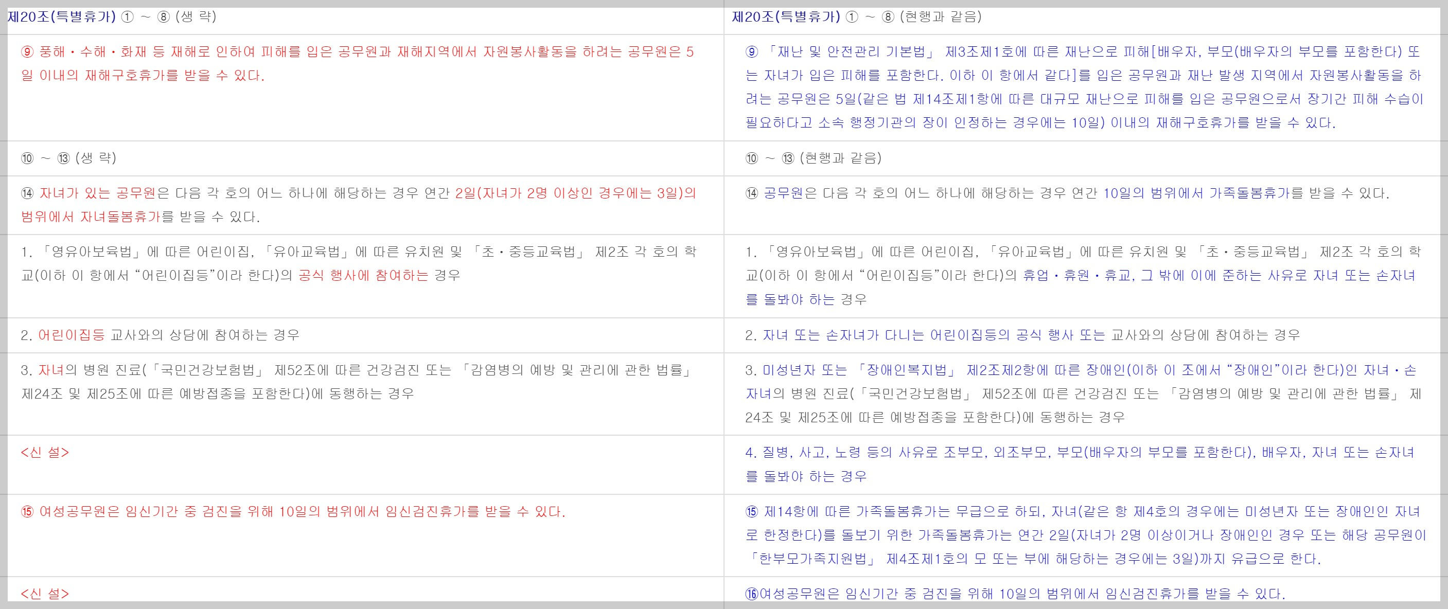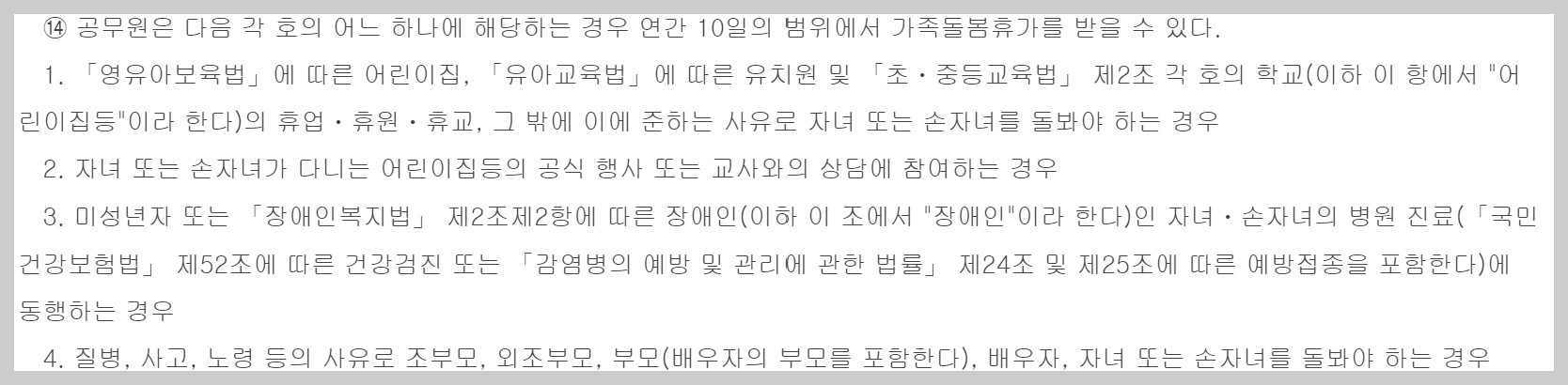 공무원의 복무 규정이 변경되어, 특별 휴가의 내용이 개정되었습니다. 이제는 자녀뿐만 아니라 조부모, 외조부모, 부모, 배우자, 손자녀 등 가족을 돌봐야 할 경우에도 연간 최대 10일까지 가족 돌봄 휴가를 사용할 수 있게 되었습니다.