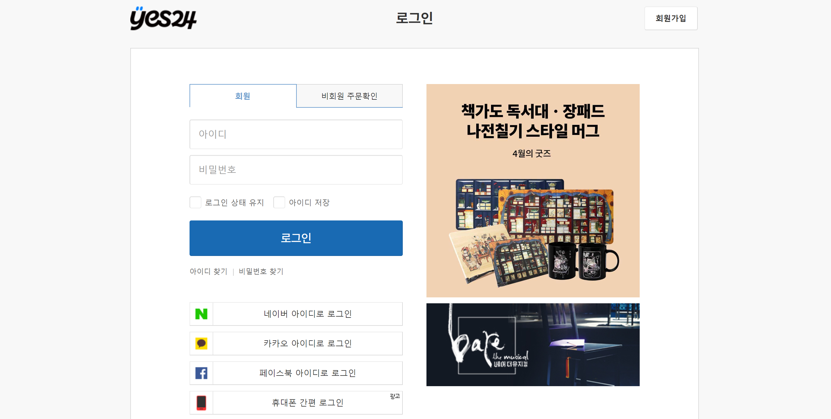 예스24에 회원가입이 안되어있는 분들은 네이버, 카카오아이디 등으로 간편 가입 후 로그인하시거나, 아이디, 비밀번호를 이용하여 가입 후 로그인해 주시면 됩니다.