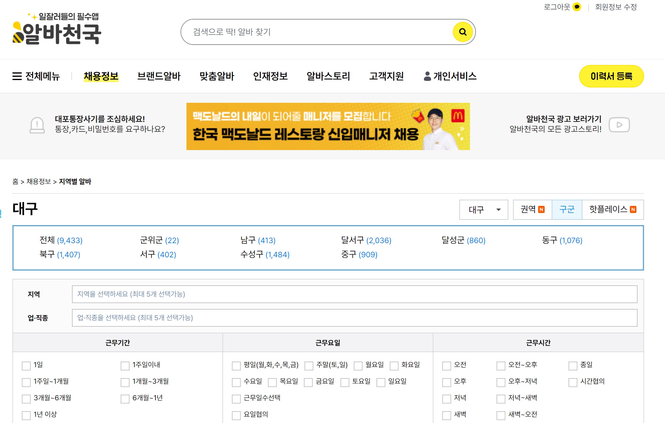 메인 화면에서는 대구를 선택하면 해당 지역의 채용정보를 구 별로 확인할 수 있습니다. 근무 기간, 근무 요일, 그리고 근무 시간을 설정하여 원하는 직종의 아르바이트를 찾아보세요.