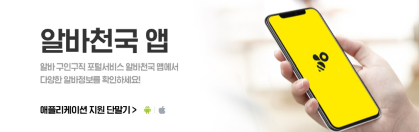 알바천국은 PC 웹사이트뿐만 아니라 모바일 애플리케이션을 통해서도 간편하게 서비스를 이용할 수 있습니다. 앱을 설치하고 어떻게 일자리를 찾을 수 있는지에 대한 자세한 안내는 아래 버튼을 클릭하여 확인해 주세요.