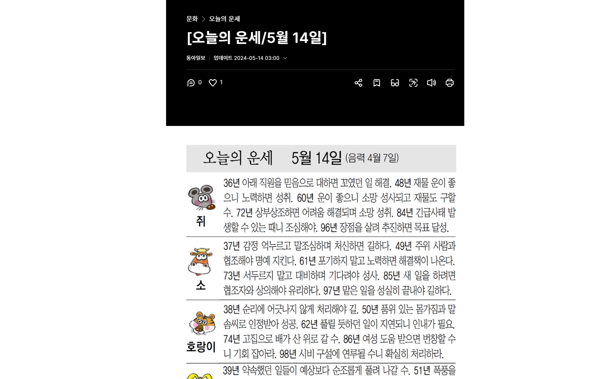 동아일보 오늘의 운세 바로가기를 클릭하면 위와 같은 화면으로 이동하여, 매일 업데이트되는 오늘의 띠별 운세를 확인할 수 있습니다. 클릭 한 번으로 간편하게 오늘의 운세를 확인하고, 새로운 하루를 시작해보세요.