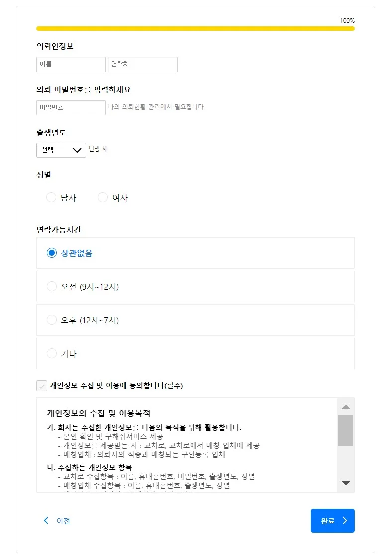 - 이름, 연락처, 출생연도, 성별, 연락가능시간을 체크후, 개인정보수집동의한다음 완료버튼을 클릭합니다.