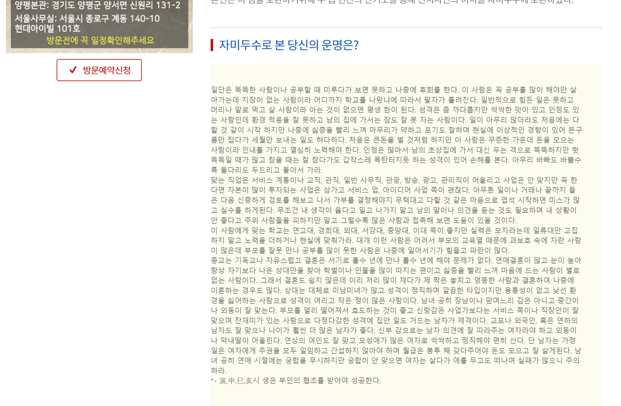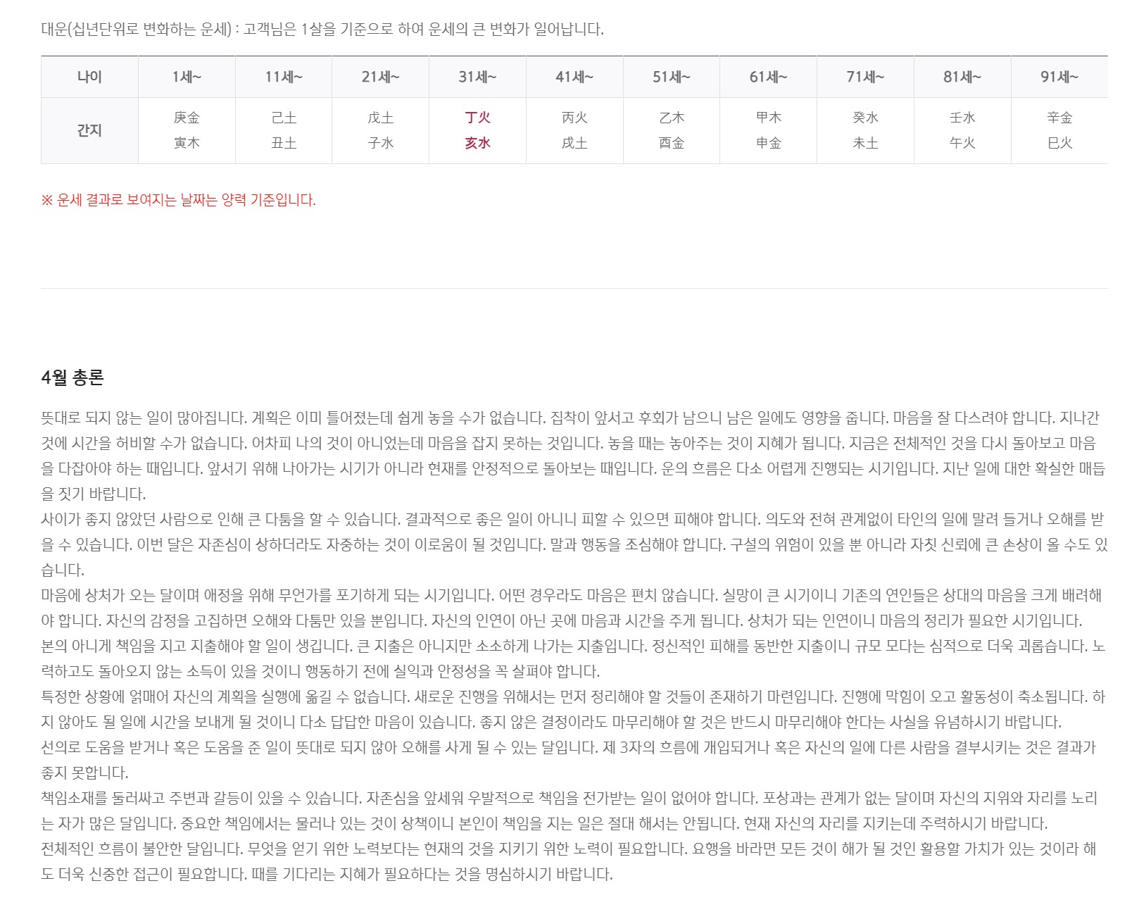 해당 사주의 성격, 맞는 직업, 성장과정, 종교, 결혼운 등 전체적인 내용을 상세하게 확인할 수 있으니 빠르고 간편하게 사주를 보고 싶으신 분들에게 추천합니다.