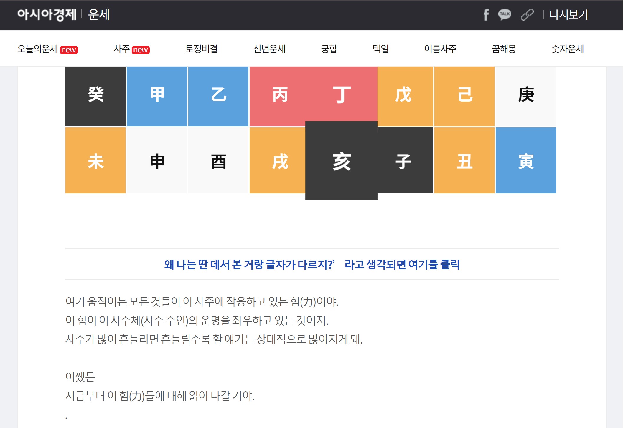 하지만 어느 사이트 보다 아시아경제는 상세하고 자세하게 사주를 풀이해 주는 편입니다.