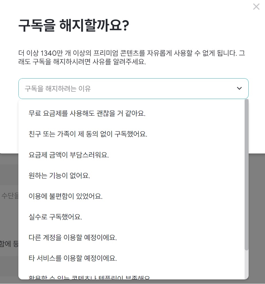 모든 혜택을 포기하고 구독 해지를 클릭하면 해지가 완료됩니다.