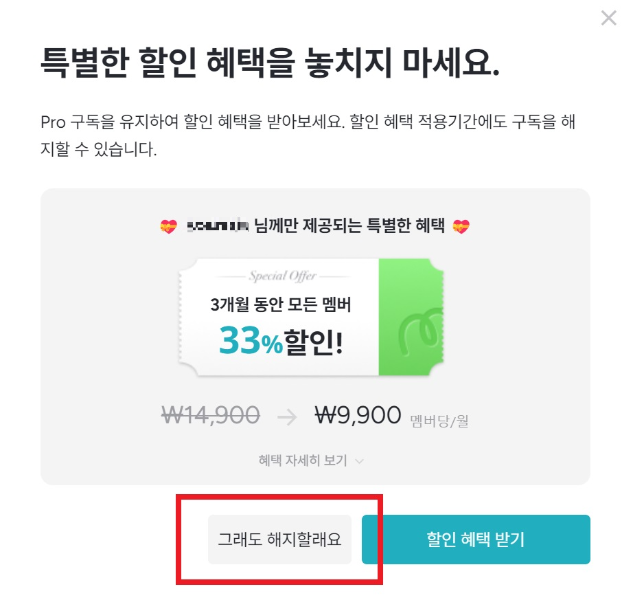 Pro요금제를 계속 유지하고 싶으신 분들은 3개월 동안 33% 할인 혜택으로 좀 더 저렴히 이용해 보실 수 있습니다.