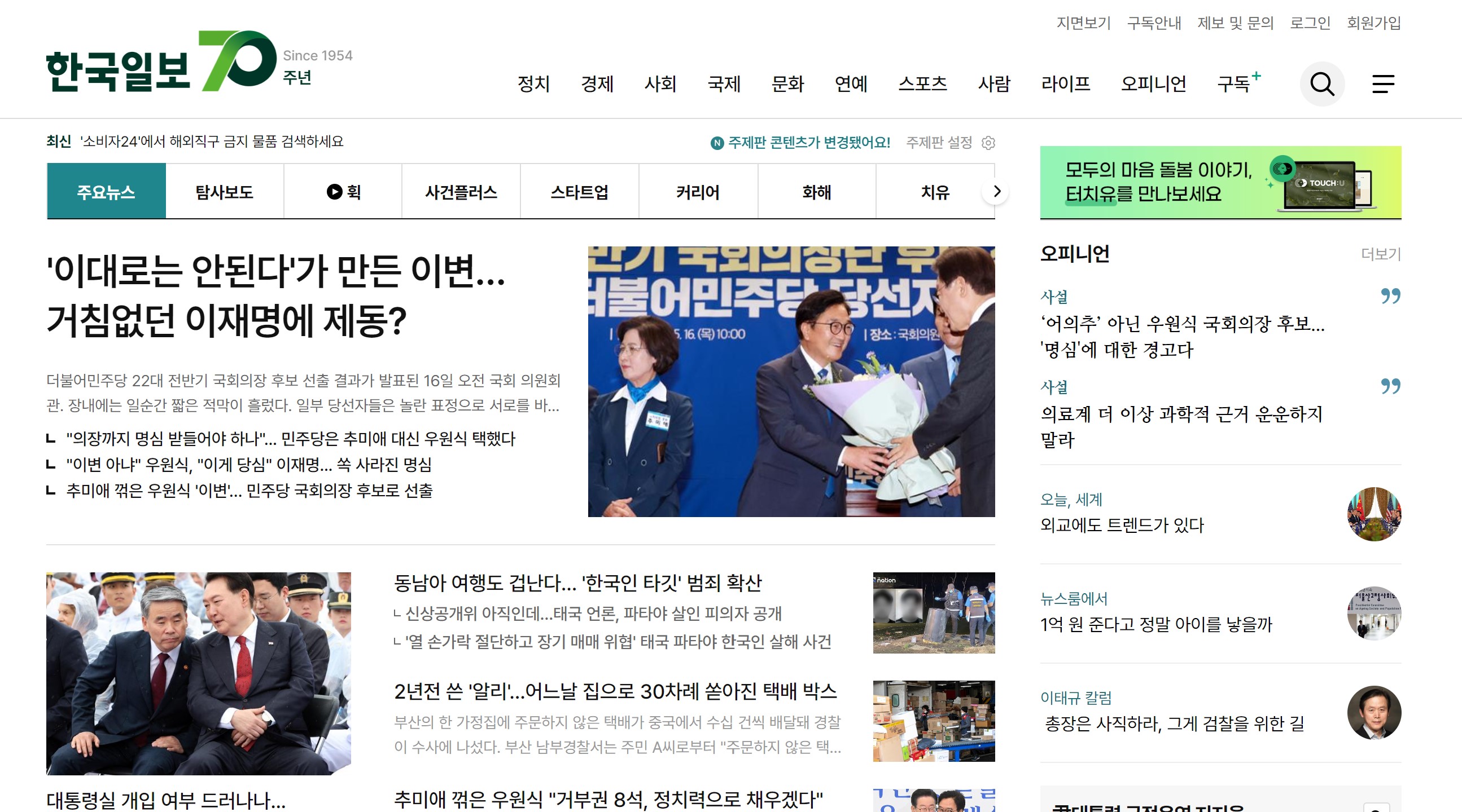 한국일보 홈페이지로 이동하면, 기존 신문과 유사한 디자인과 분위기가 유지된 메인 화면에서 다양한 뉴스와 정보를 쉽게 확인할 수 있습니다.