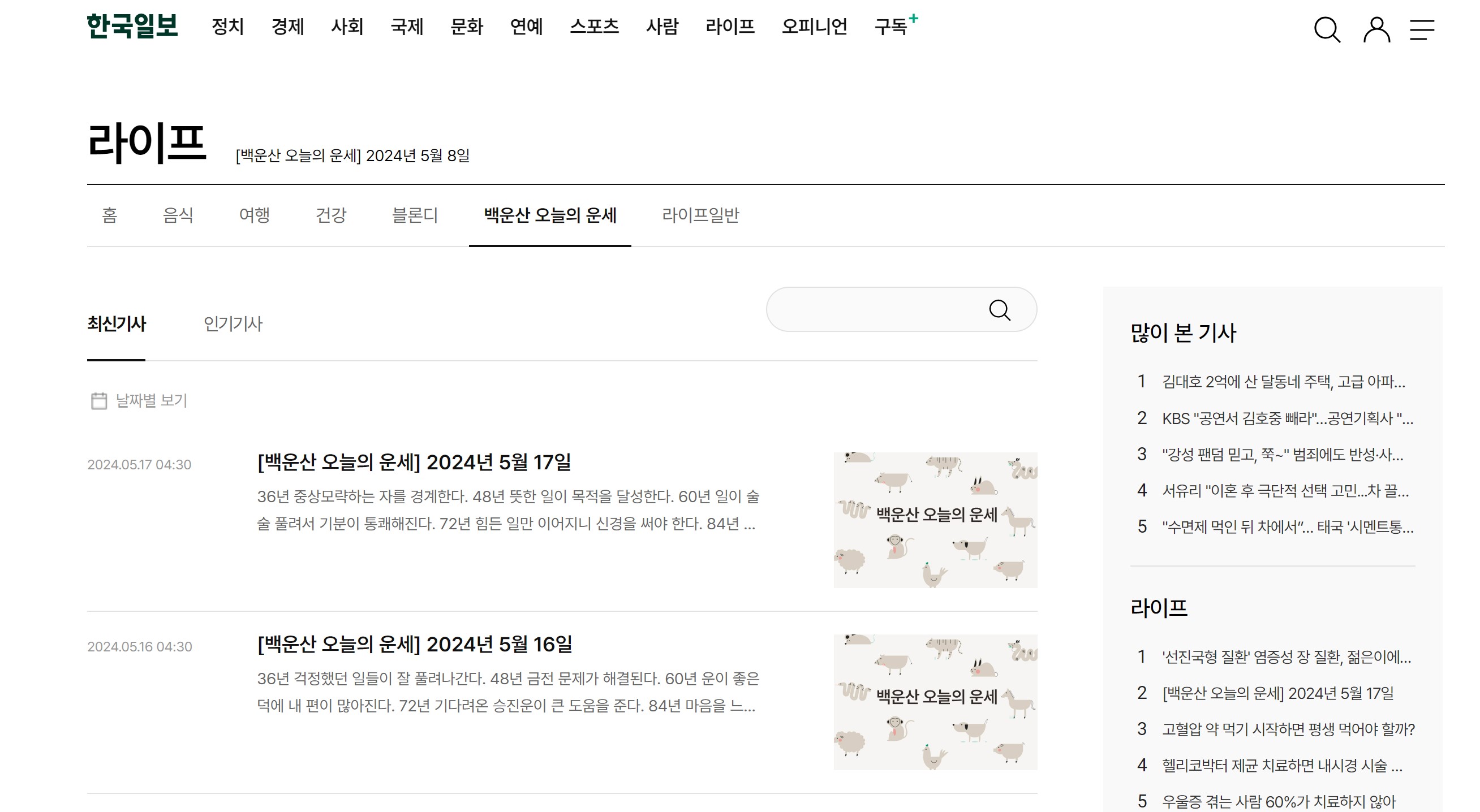 한국일보에서는 유명한 역술가 백운산이 연재하는 오늘의 운세를 만나보실 수 있습니다.