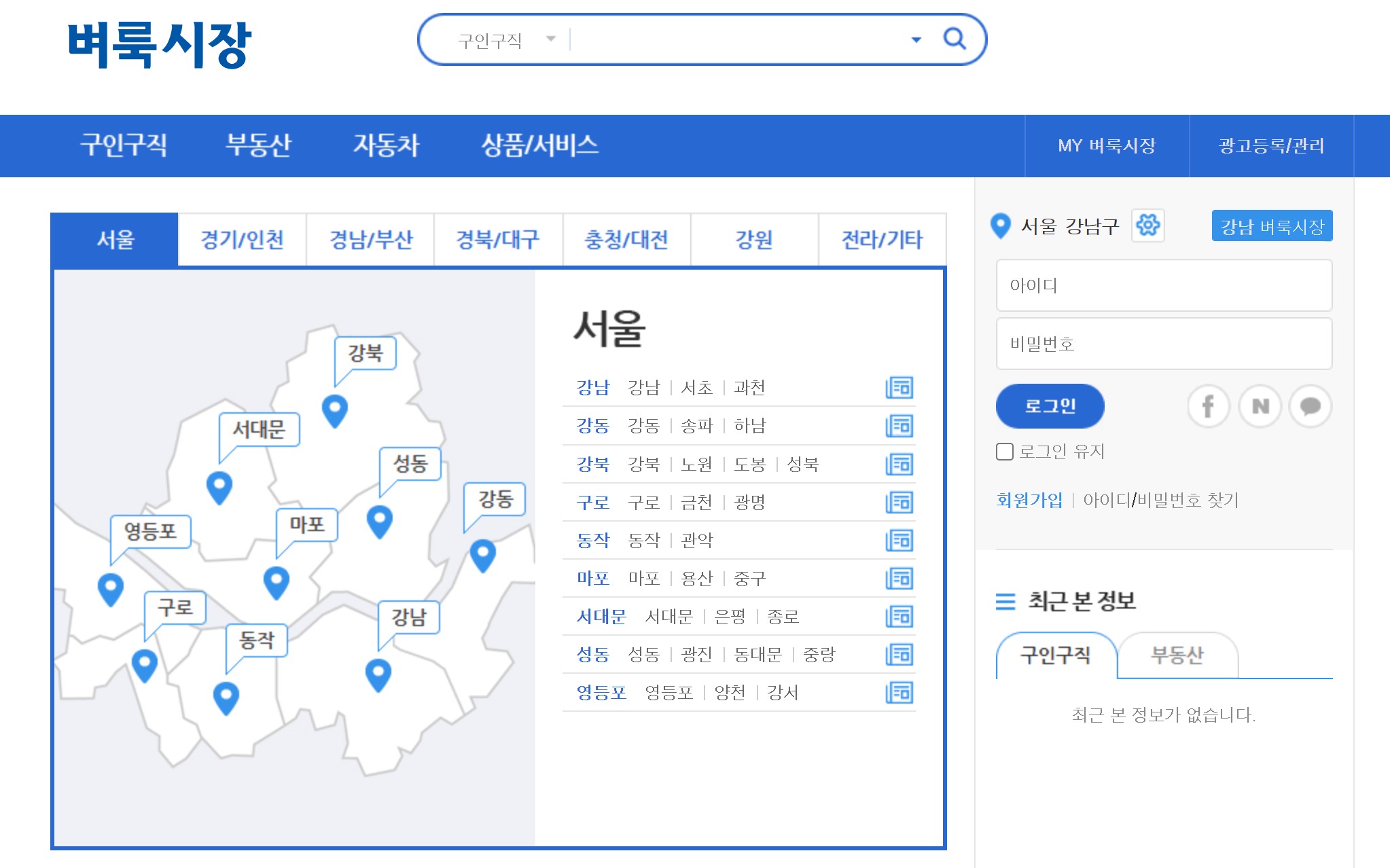 서울, 경기/인천, 경남/부산, 경북/대구, 충청/대전, 강원, 전라도 지역별, 세부 지역정보를 확인 할 수 있습니다.