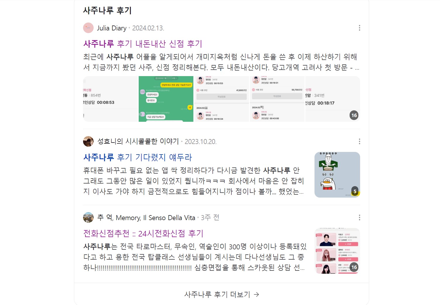 네이버에 사주나루를 검색해 보면 후기 글을 많이 볼 수가 있습니다. 대부분 후기를 보면 상담사별로 장단점 비교글 또는 매우 만족한다는 내용이고, 상담사 선생님 추천글도 많으니 검색글의 후기 통해서도 원하는 상담사를 선택하여 상담을 받아보시기 바랍니다.
