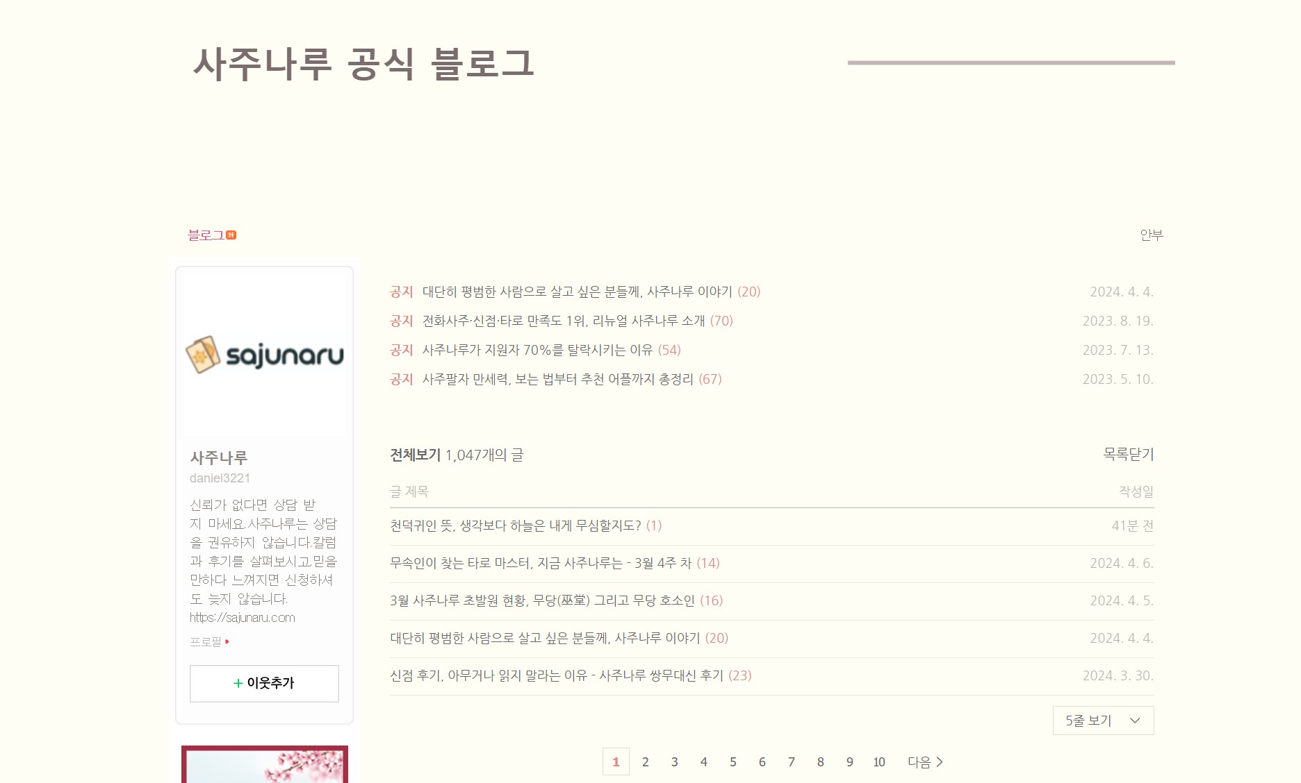 사주나루에는 공식 블로그도 운영되고 있습니다. 이곳에서는 후기뿐만 아니라 사주나 신점에 관심 있는 분들이 읽어볼 만한 다양한 게시글들이 많이 올라와 있습니다. 사주나루가 어떤 방향성을 가지고 운영되고 있는지에 대한 신념을 확인할 수 있어, 더욱 믿고 선택할 수 있을 것입니다. 아래 버튼을 이용하여 사주나루 공식 블로그를 방문해 보세요.
