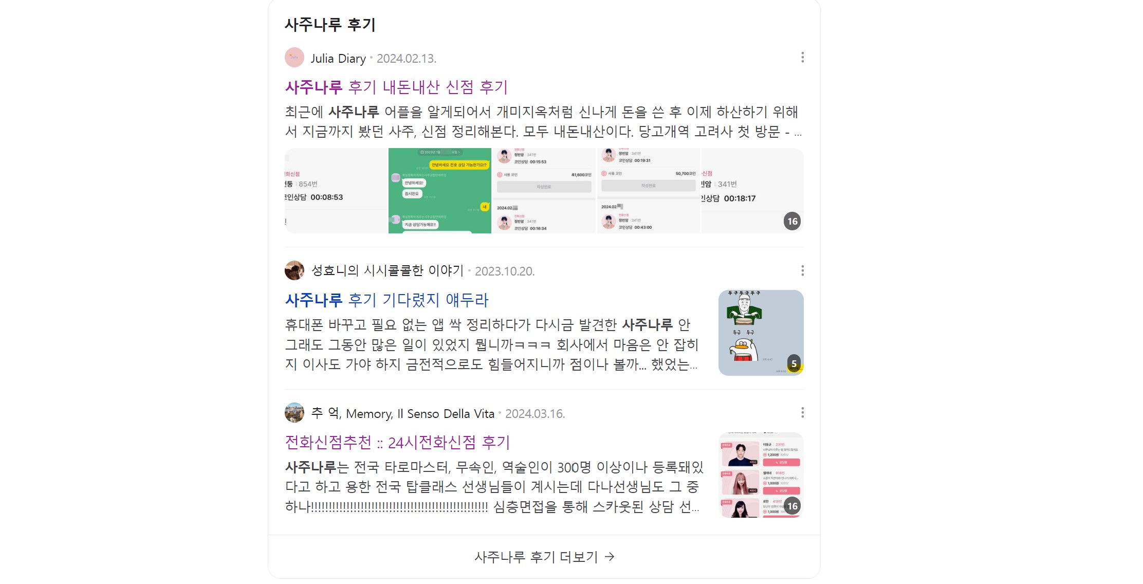 사주나루는 공식 블로그를 운영하고 있습니다. 이곳에는 후기뿐만 아니라 사주와 신점에 관심 있는 분들을 위한 다양한 게시글이 올라와 있습니다. 여기서는 사주나루가 어떤 방향으로 운영되고 있는지에 대한 신념을 확인할 수 있어, 더욱 신뢰하고 선택할 수 있을 것입니다. 아래 버튼을 클릭하여 사주나루 공식 블로그를 방문해 보세요.