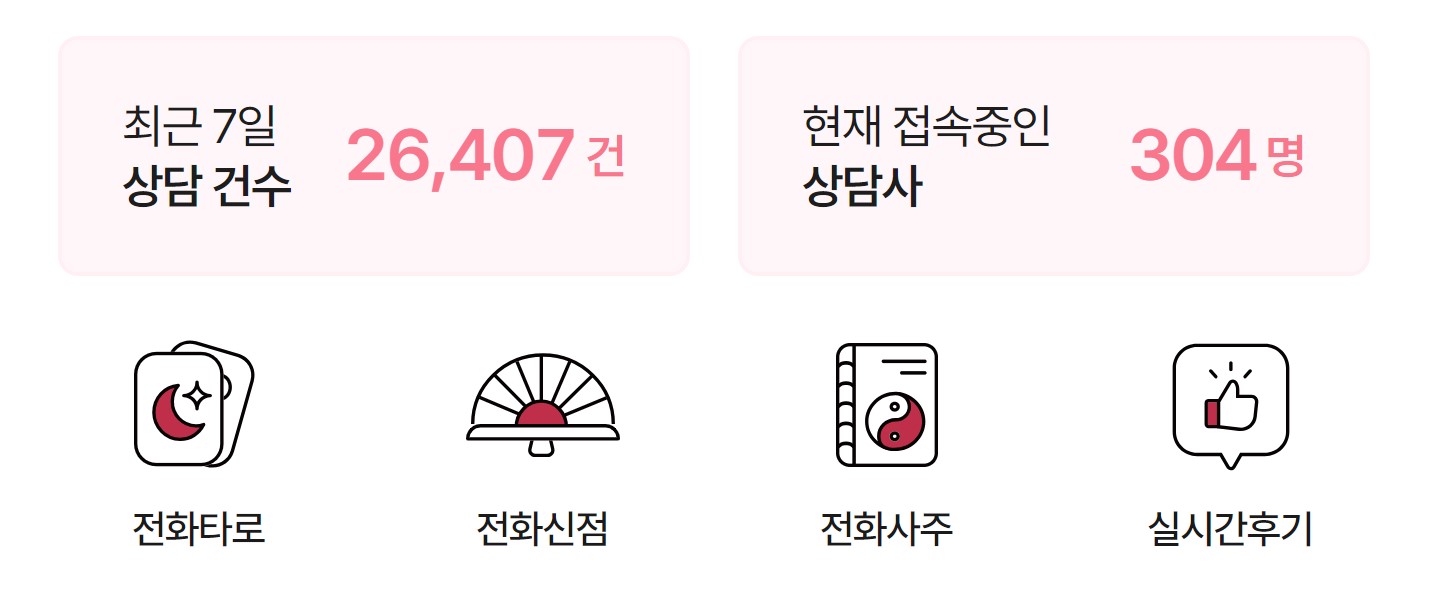 사주나루는 타로, 점술, 사주에 관한 전화 상담 서비스입니다. 매일 4천 건 이상의 상담 건수와 300명 이상의 활동 중인 상담사를 보면, 이 플랫폼이 얼마나 거대한 규모인지 짐작할 수 있습니다.