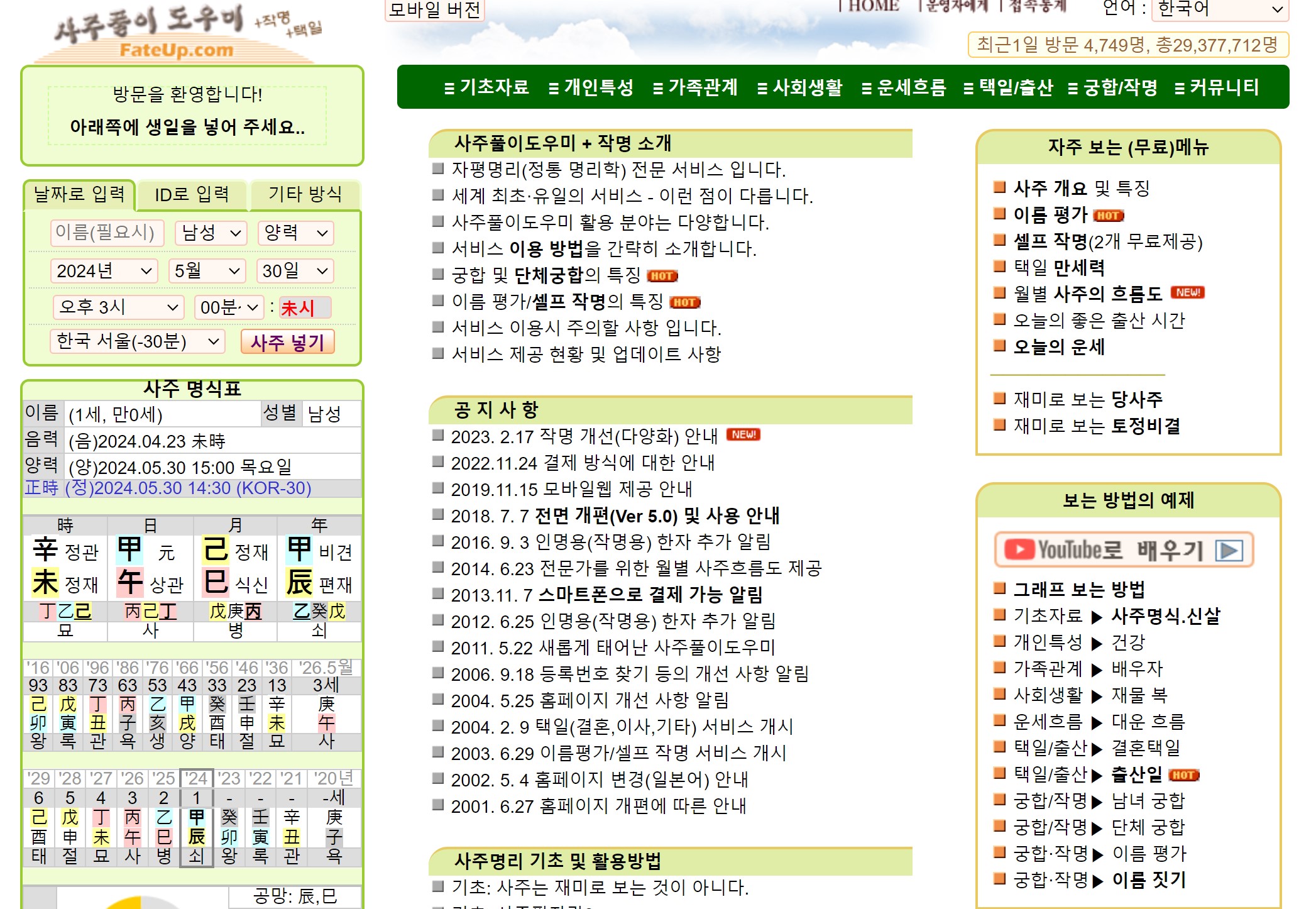 사주풀이 도우미는 셀프작명, 택일 만세력, 오늘의 운세, 토정비결 등 다양한 사주풀이를 무료로 제공하는 인기 있는 사이트입니다. 많은 사람들이 신뢰하고 즐겨 사용하는 사이트로 잘 알려져 있습니다. 이번글에서는 사주풀이 도우미 사이트에서 이용할 수 있는 다양한 무료 사주풀이 서비스를 소개해드리려고 합니다. 사주에 관심이 있다면 지금 바로 여러분의 운세를 확인해 보시기 바랍니다.