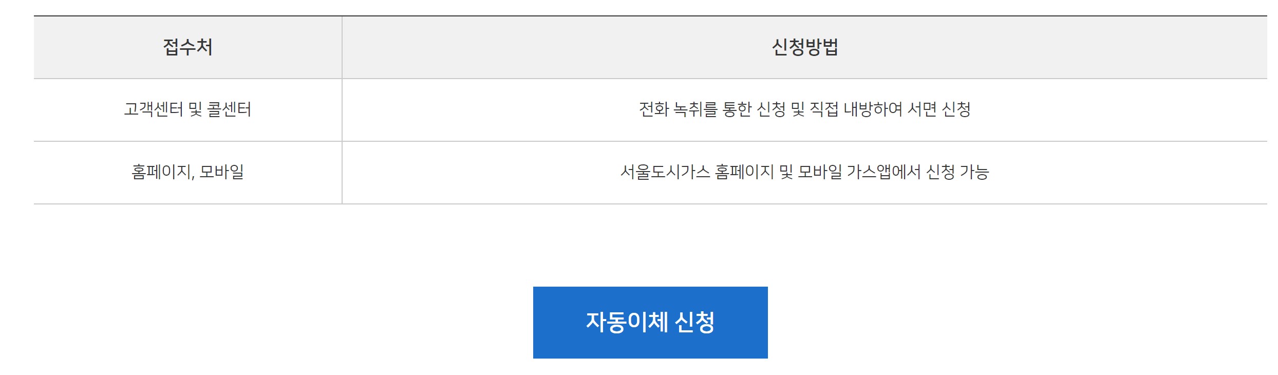 자동이체 신청절차는 고객센터 및 콜센터를 통해서 전화 녹취를 통한 신청 및 직접 내방하여 신청할 수 있으며, 홈페이지나 모바일에서는 서울도시가스 홈페이지 및 가스앱 어플 통해서 신청 가능합니다.