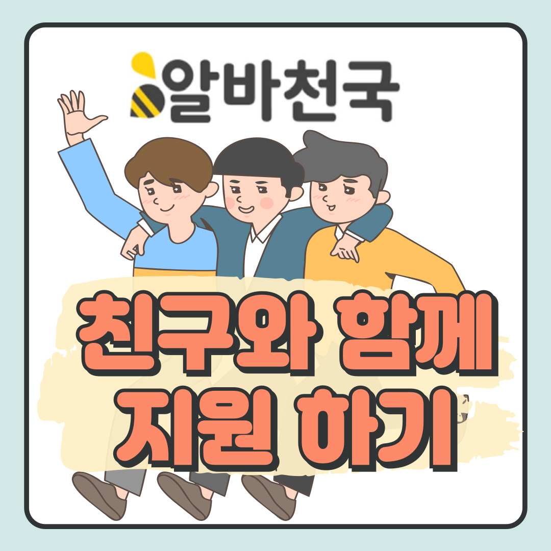 알바천국에서 새로운 '친구와 함께 지원하기' 서비스를 출시했습니다. 원하는 아르바이트 공고를 친구에게 공유하면, 친구와 함께 손쉽게 지원할 수 있습니다.