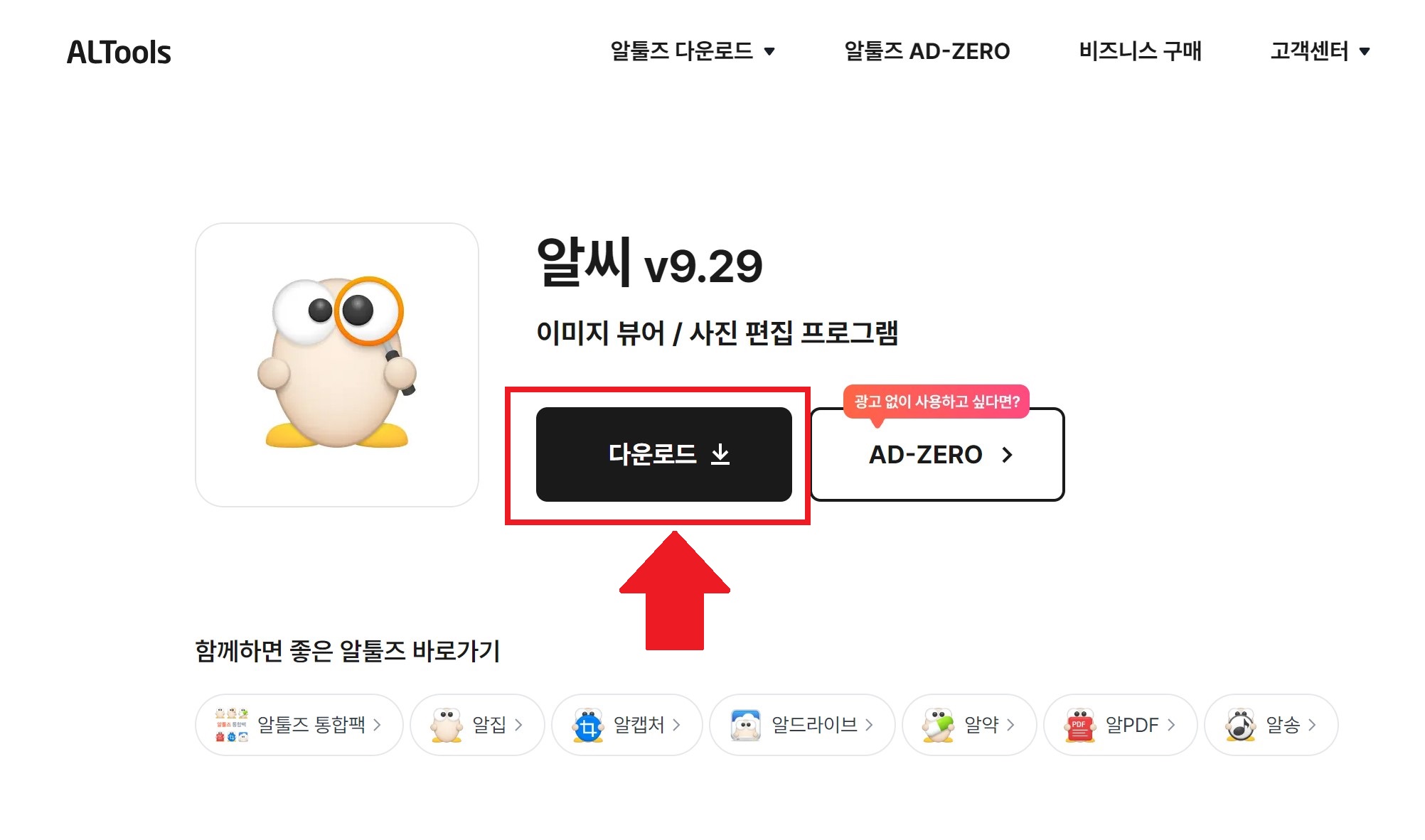 알씨 다운로드하는 방법으로는 검색창에 '알툴즈'를 검색하시거나 아래에 바로가기 링크를 통해 알씨 다운로드 화면을 접속합니다. 화면에서 다운로드 버튼을 클릭합니다.