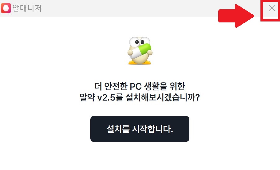 다음화면에 제품실행 버튼을 클릭하게 되면 알약 v2.5를 설치할 건지 묻는 창이 나오는데, 필요 없으면 상단에 X를 클릭해 주면 됩니다. 자동실행되지 않으니 바탕화면이나 시작프로그램에 생긴 '알캡처' 아이콘을 클릭하여 실행합니다.