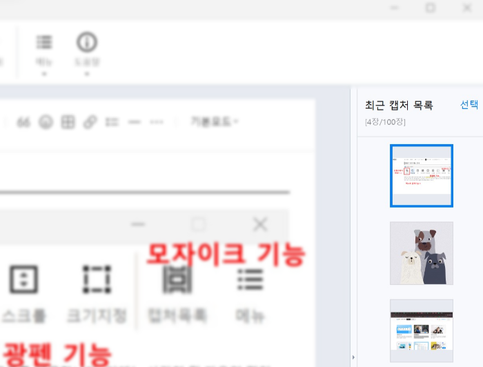 캡처 이후에 화면에서는 도형 그리기와 형광펜으로 줄 긋기, 텍스트 입력, 모자이크 등 바로 편집할 수 있게 나오니 윈도우에 기본 제공되는 캡처도구와는 다른 편리한 기능이 있습니다.