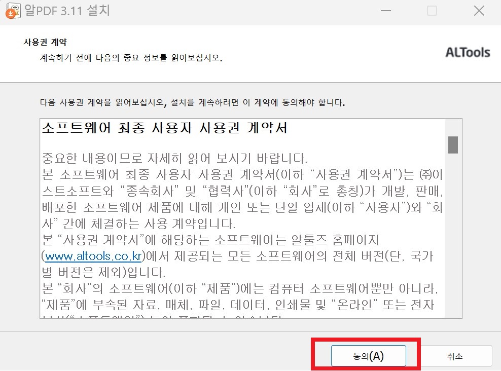 사용권계약서가 나오면 동의를 클릭하셔야 설치가 진행됩니다.