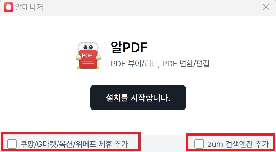 다음화면에 필요없는 기능이 자동체크된 경우 해제하시고 '설치를 시작합니다.'를 클릭해 줍니다.
