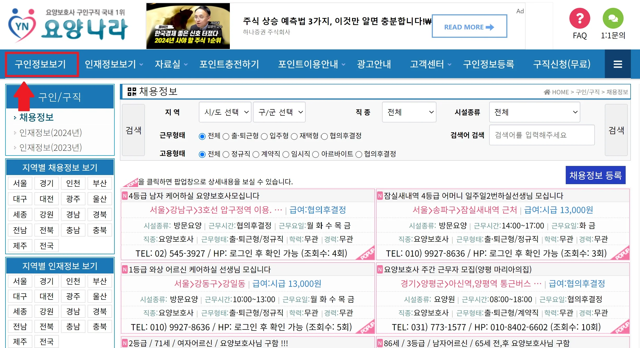 요양나라의 구인 정보 페이지에서는 전국의 다양한 요양보호사 일자리를 검색할 수 있습니다.