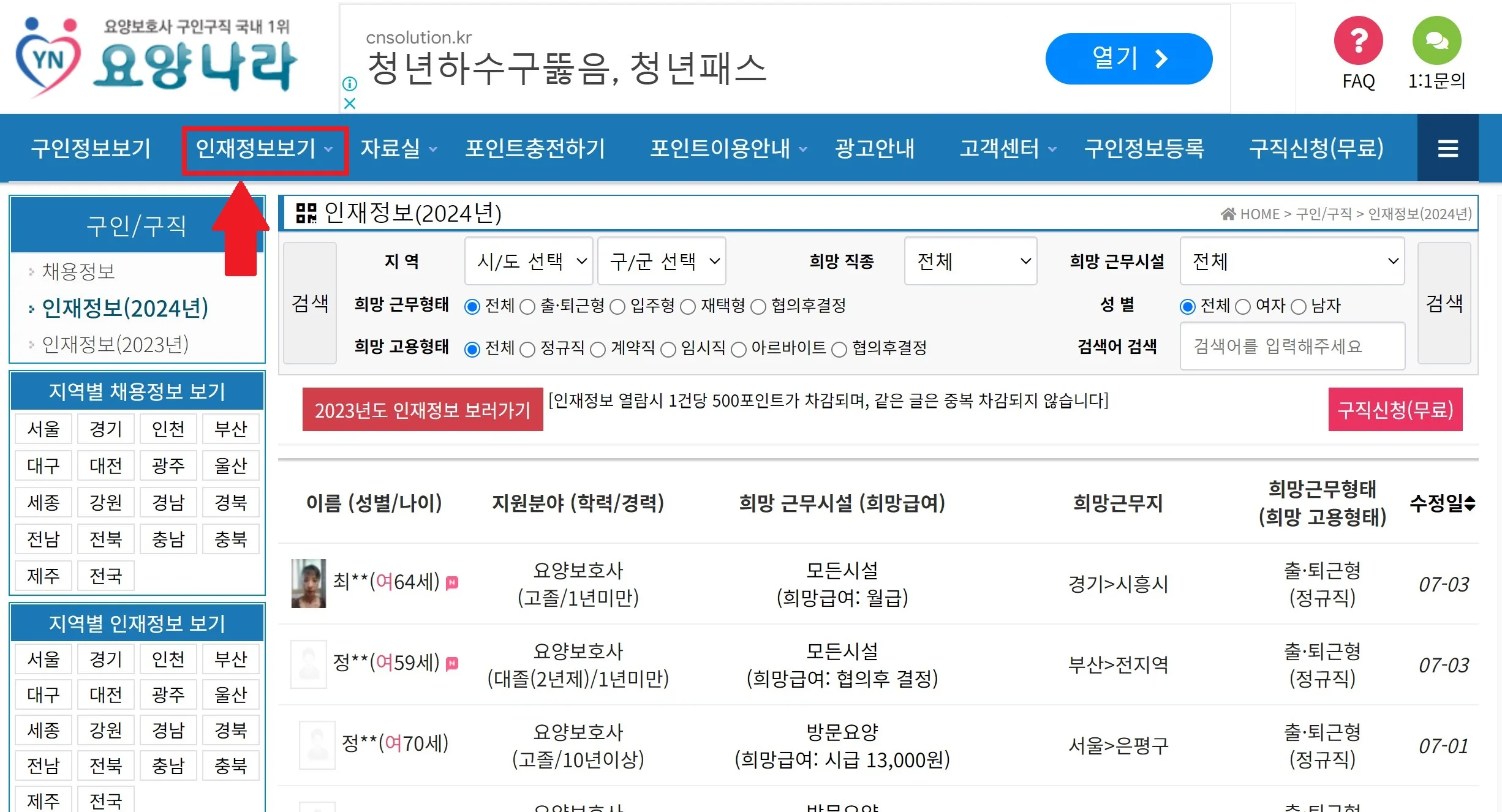 '인재정보보기' 메뉴에서는 요양보호사로서 구직을 원하는 분들이 자신의 이력서를 등록하고, 채용을 원하는 시설에서 이를 열람할 수 있도록 지원합니다.