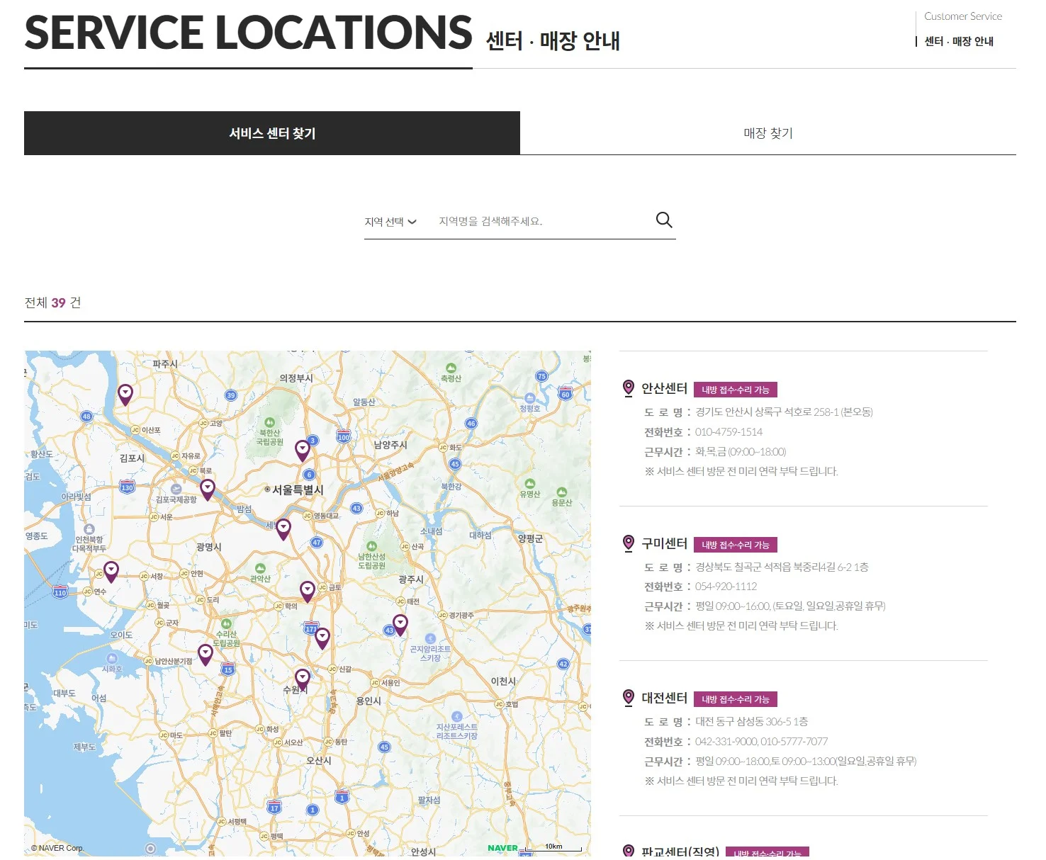 아래 바로가기 버튼 이용하시면 서비스센터 검색화면으로 바로 이동 가능합니다.