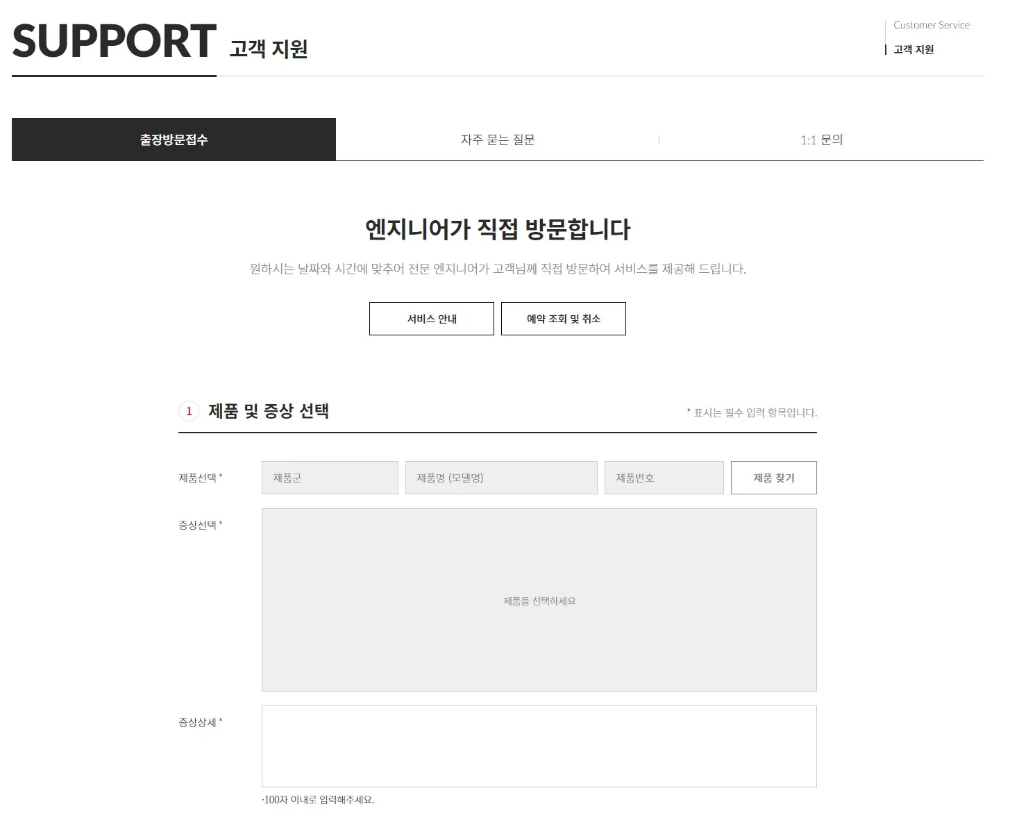 출장방문 서비스는 로그인후 이용 가능하며, 제품 및 증상을 입력하고 신청인정보와 지정센터를 선택하면 접수가 완료 됩니다.