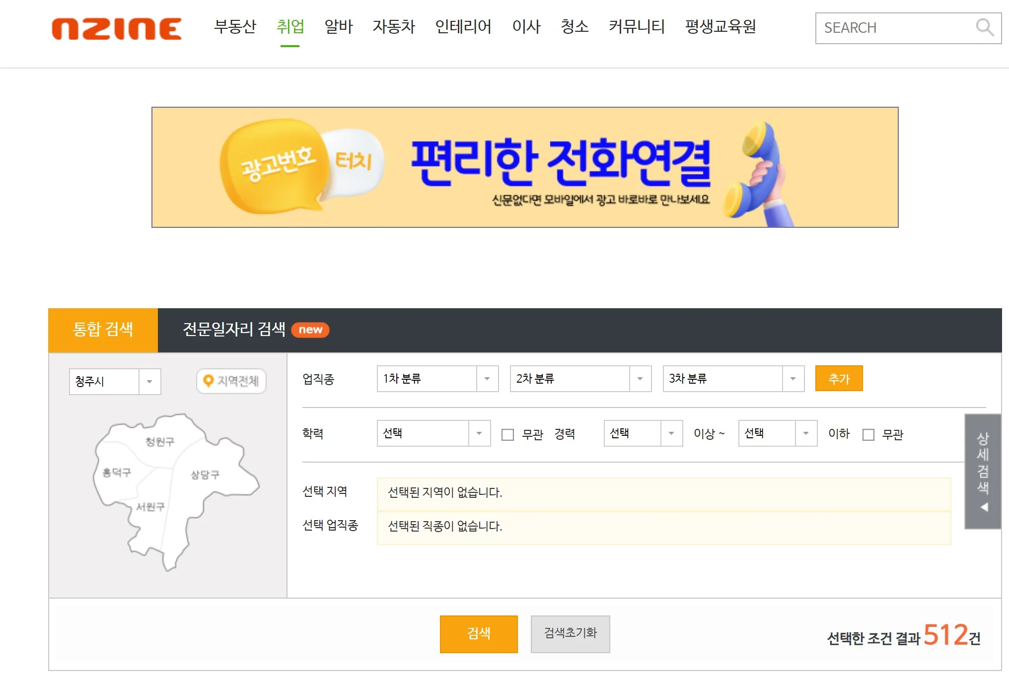 청주 교차로 구인구직 일자리 정보를 확인하시는 방법은, NZINE 메인화면에서 취업 메뉴를 선택합니다.