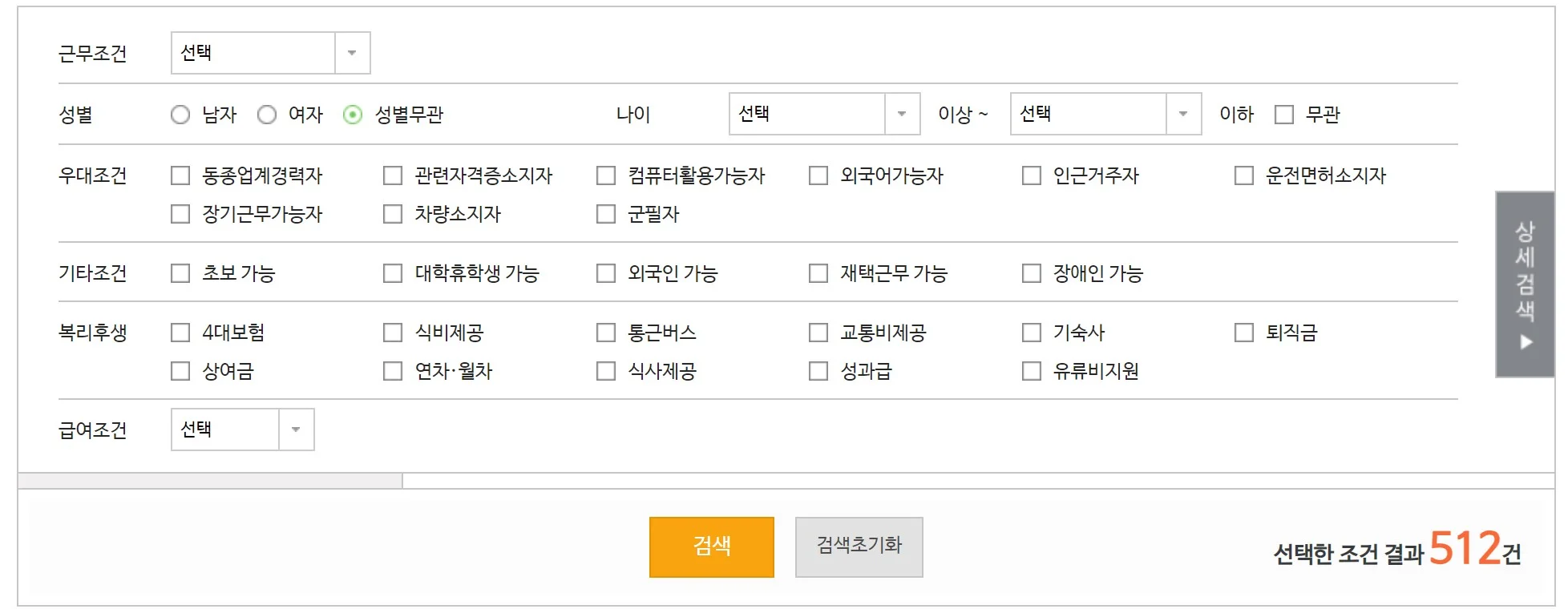 오른쪽 상세검색 회색 바를 클릭하시면 보다 상세한 근무조건에 대해서 설정하실 수 있습니다.
