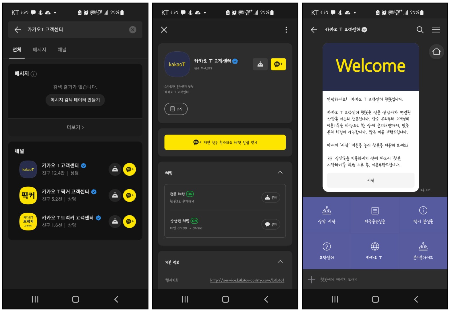 하단에 검색된 카카오 T 고객센터 채널을 친구추가 하면 바로 이용하실수 있습니다.