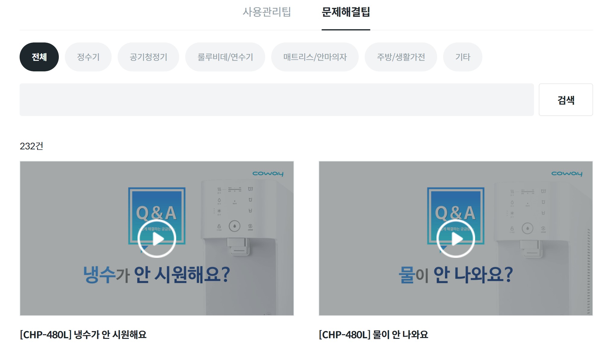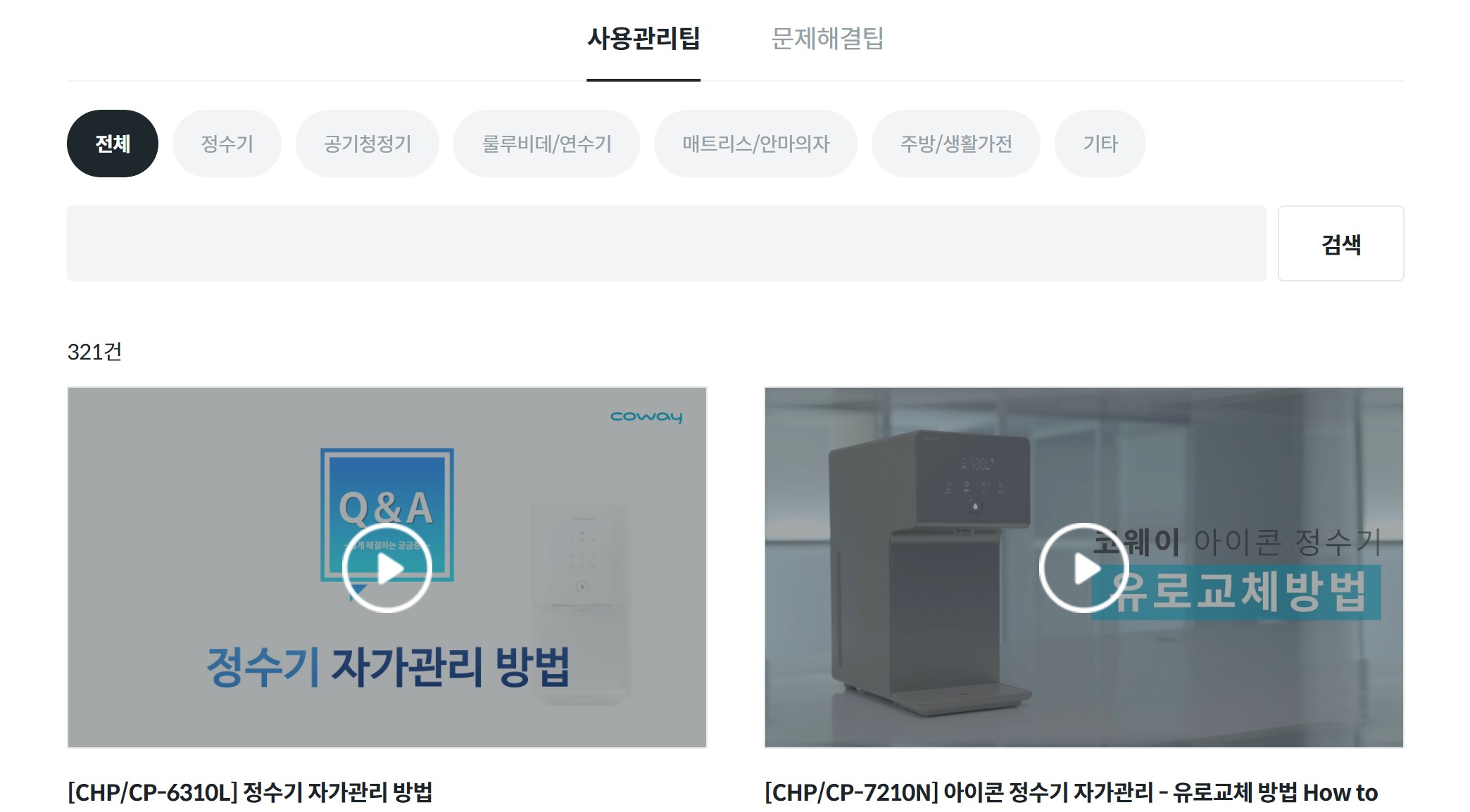 코웨이 제품 이용 시에는 AS를 신청하기 전에 자체적으로 문제를 확인하고 해결할 수 있는 사용 관리 및 문제 해결 팁을 제공하고 있습니다. 아래와 같이 동영상 자료를 통해 고객들이 손쉽게 접근할 수 있어 간단한 문제는 직접 해결 해볼 수 있게 도움을 드리고 있습니다.