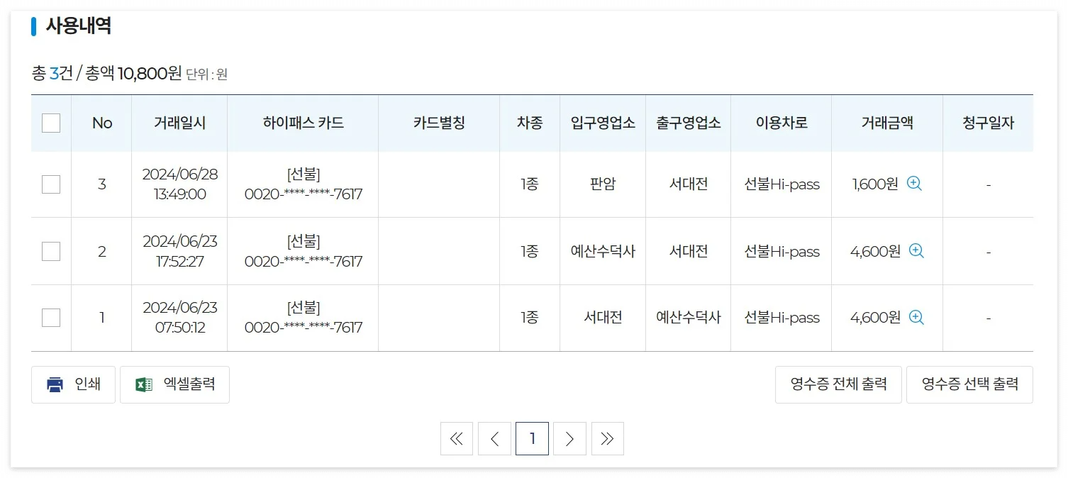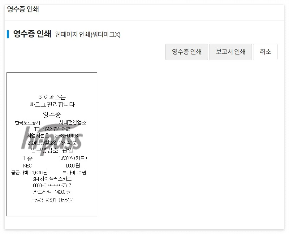 하이패스 사용내역 조회 : 영수증 출력 바로가기