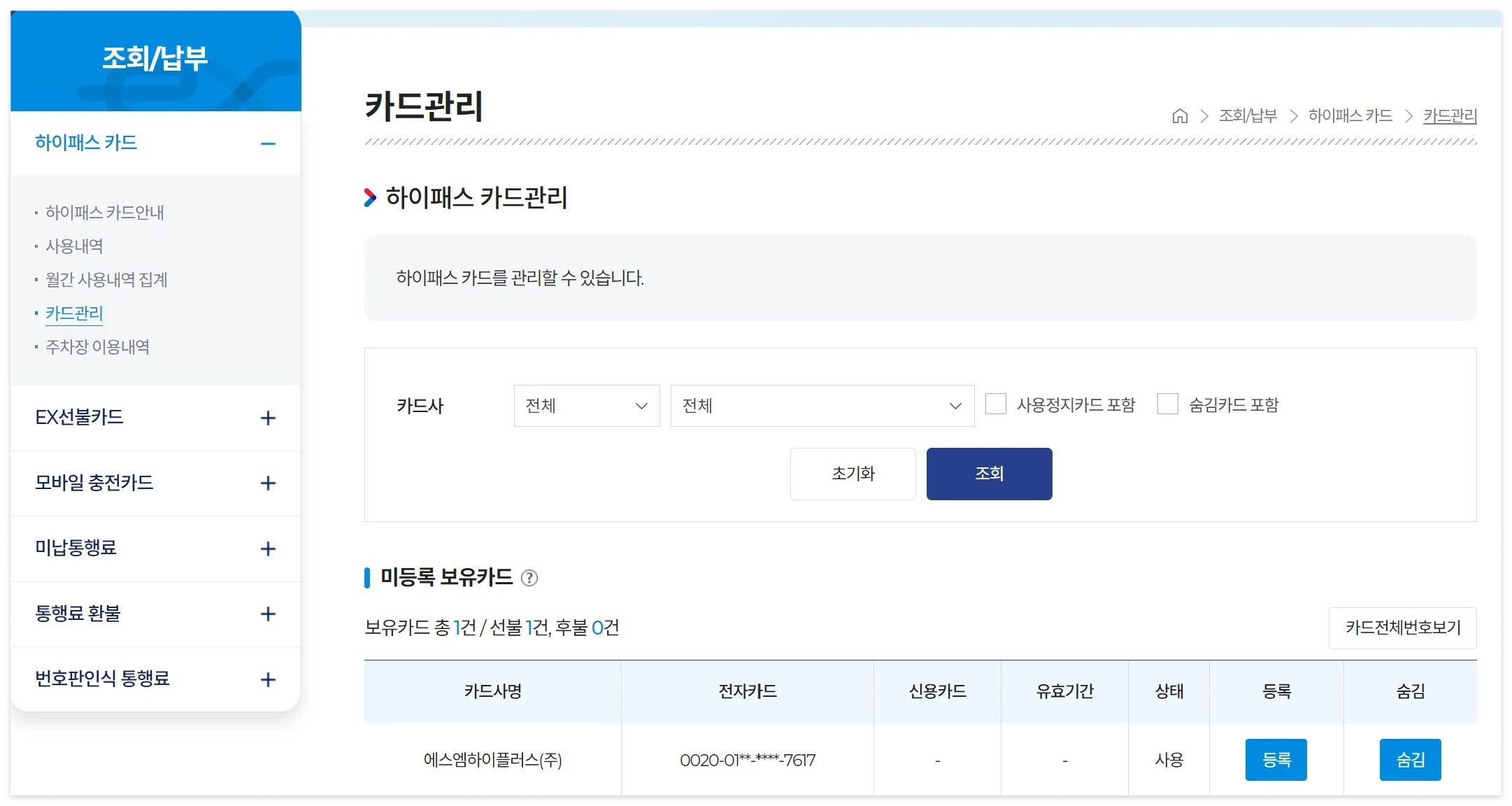 조회/납부 메뉴에서 하이패스카드-카드관리 메뉴로 이동하면 미등록 보유카드가 자동으로 나오고 파란색 등록버튼을 클릭하면 바로 등록이 가능합니다.