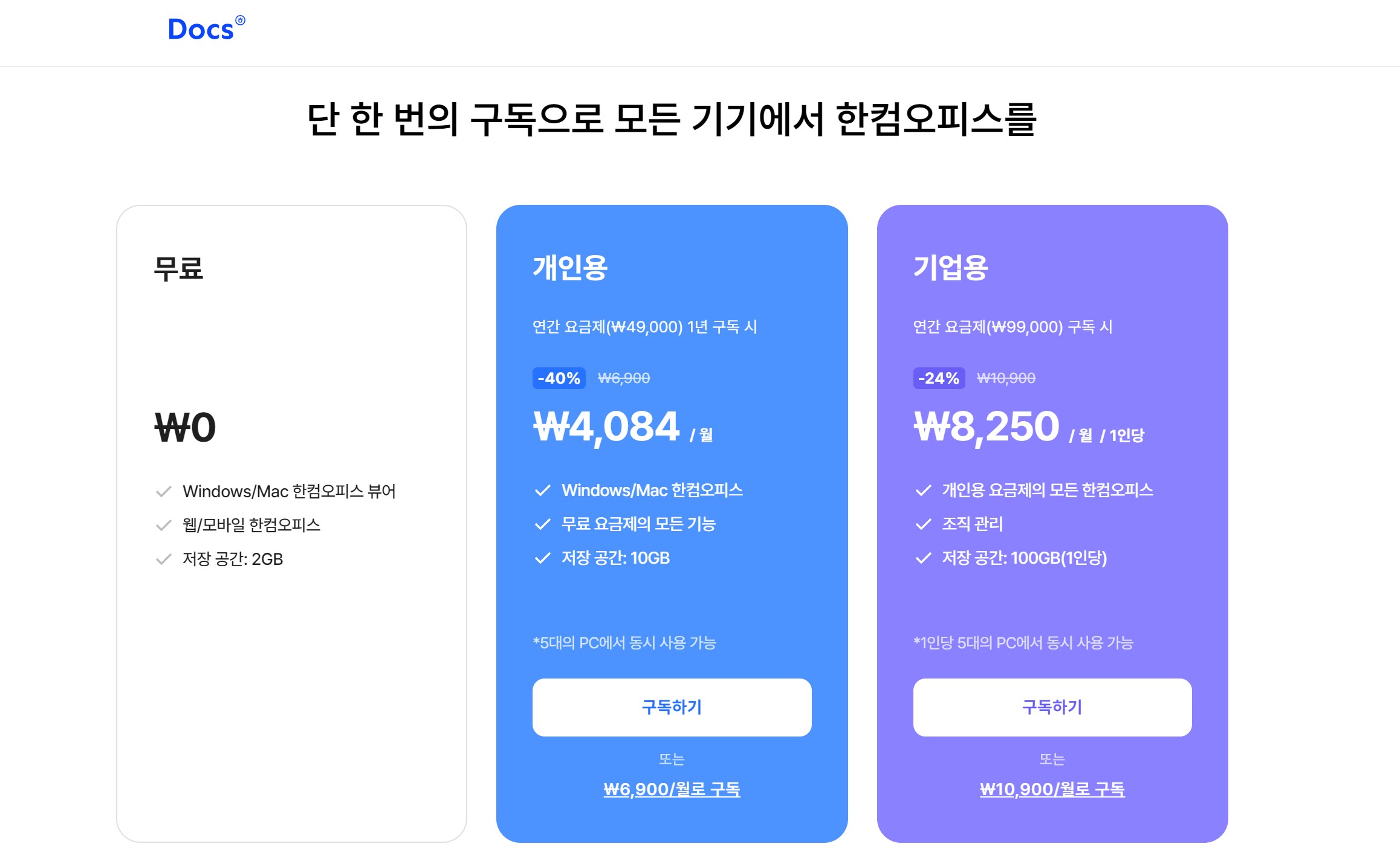 한컴 오피스 | 한컴 독스 [무료] | 한컴 독스 [유료-개인] | |